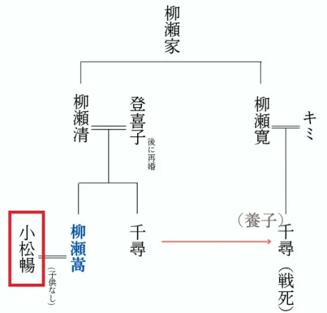 - 小松総一郎:夫(親等なし) – 戦前に結婚し、戦地から帰還後に病で亡くなった最初の夫。